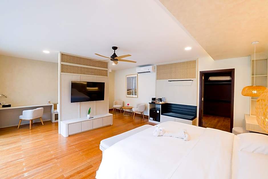 Offering more space, this two-bedroom villa has living and dining areas that open up to a private pool with sun chairs and a gazebo. Modern amenities include air conditioning and a flat-screen TV with satellite channels. The kitchenette comes with a refrigerator, a microwave, and an electric kettle. The semi open-plan bathroom features a shower and a free-standing bathtub. Extras include bathrobes, slippers, free toiletries.